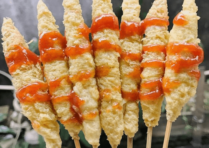 - Tuangkan telur ke dalam minyak panas sambil digulung dengan tusuk sate.